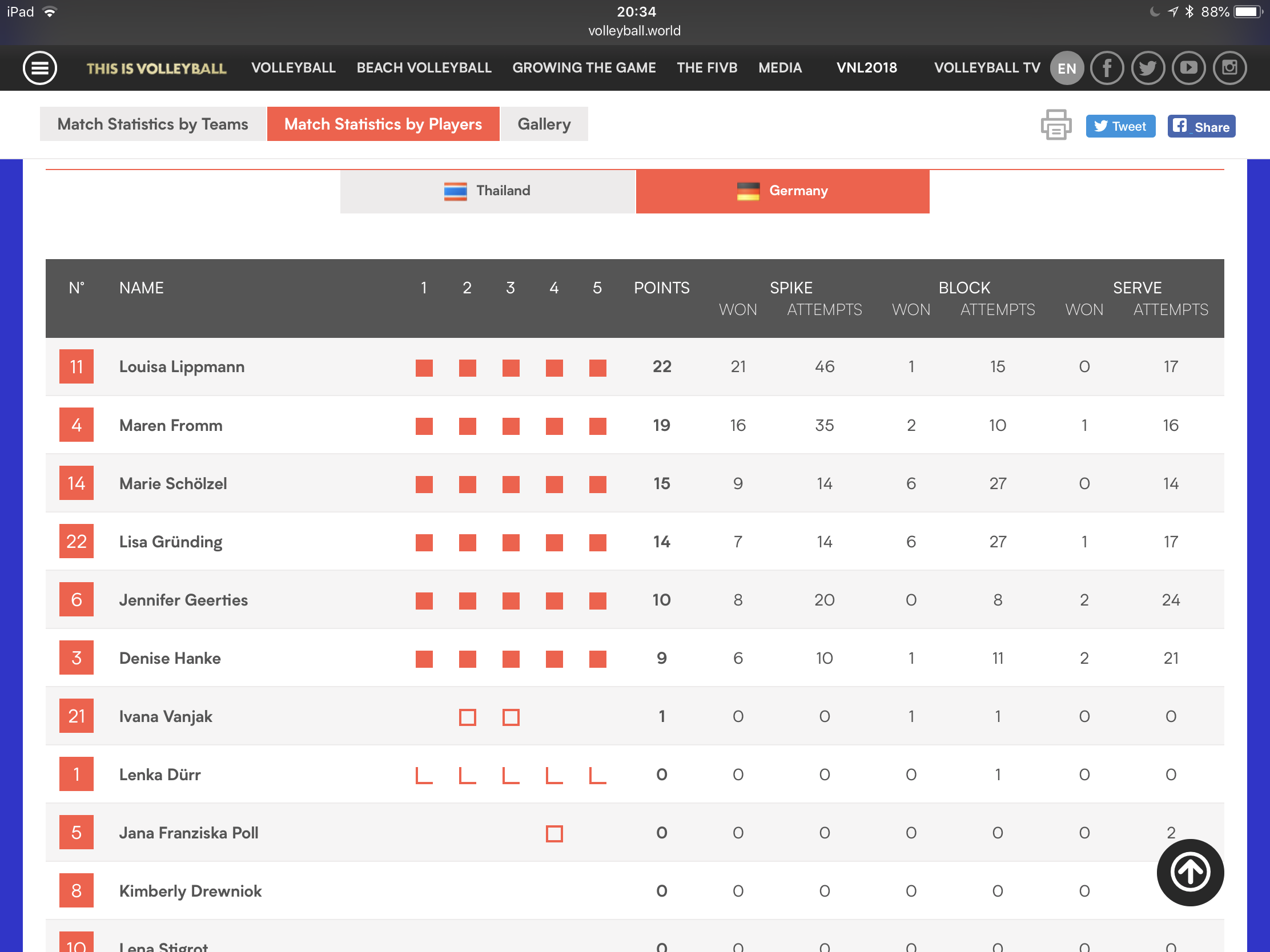 *** สถิติผู้เล่น VNL 2018 ไทย 2-3 เยอรมัน *** เพียวท๊อปสกอร์ ตบ53%