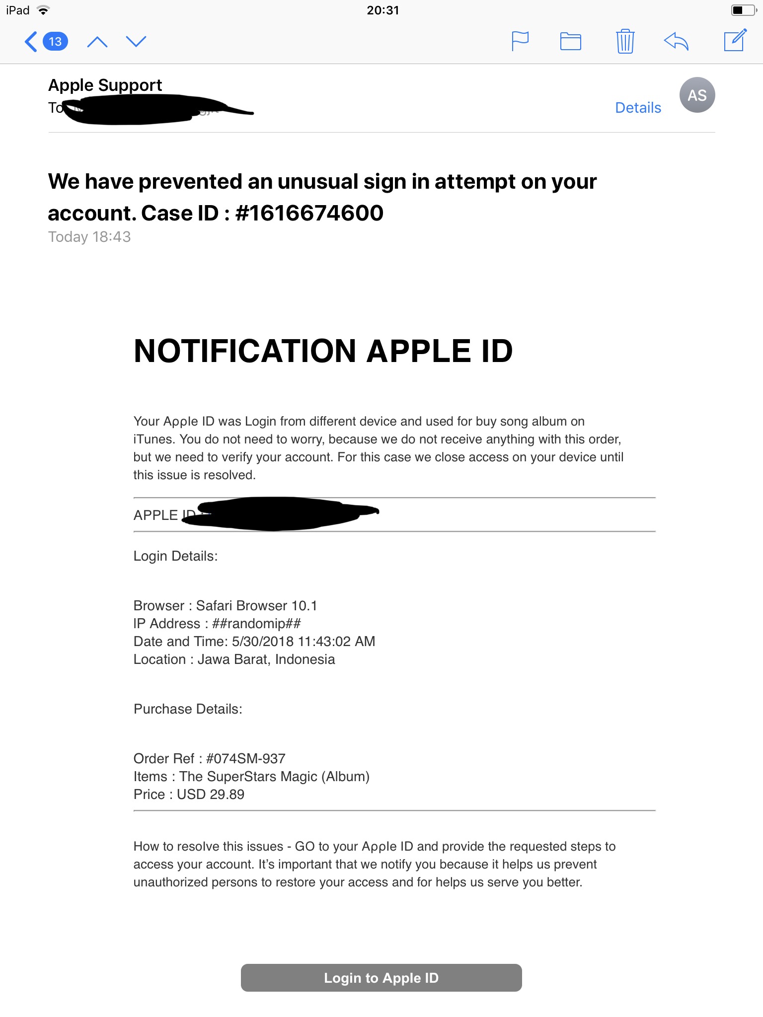 ตกใจหมดเลย เกือบไปแล้วค่ะ ตอนแรกอ่านอีเมลตกใจว่ามีใครแอบมาใช้ Apple ID เราซื้อเพลง. กำลังจะดำเนินการต่อ คลิกไปที่ log in to Apple id แล้วมันขึ้น url แปลกๆเลยนึกขึ้นได้ว่ามันอาจเป็นสแปม ฝากแชร์เพื่อนๆด้วยค่ะ. เราเคยได้ยินมาเยอะ. แต่ไม่เคยเจอกับตัว ครั้งนี้ครั้งแรกเลย