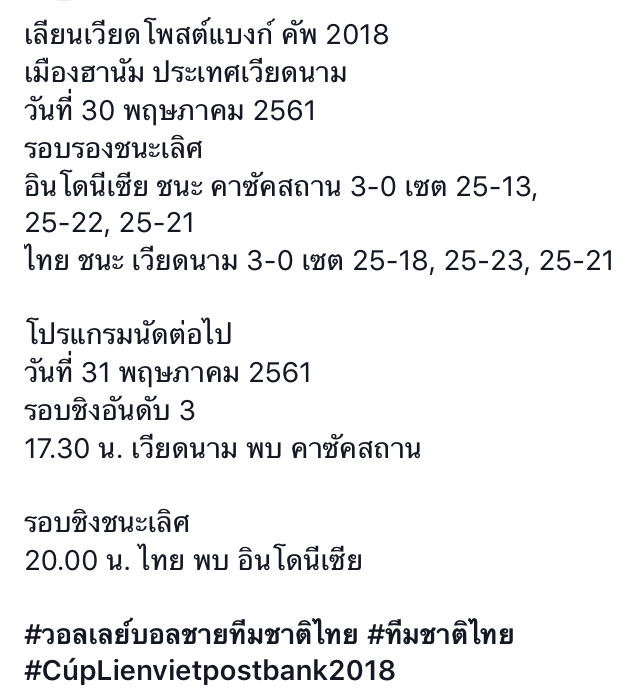 [[วอลเลย์บอลชาย]] รายการเลียนเวียดโพสต์แบงค์ 2018 ทีมชายไทยชนะเจ้าภาพเวียดนาม เข้าไปชิงชนะเลิศได้สำเร็จ