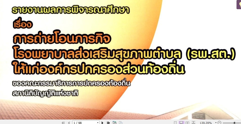 รายงานของรัฐสภาเรื่อง การถ่ายโอนโรงพยาบาลส่งเสริมสุขภาพตำบล จาก Facebook ที่นี่..