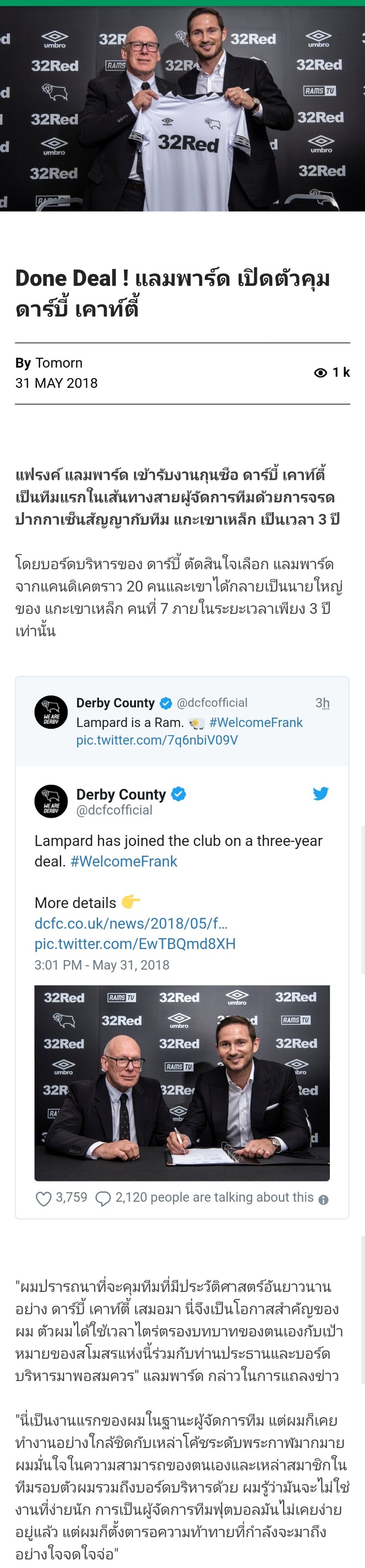 OFFICIAL!!! LAMPARD รับงานคุม DERBY ในแชมป์เปี้ยนชิพ