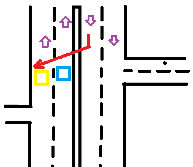 ในกรณีนี้ กรอบสีฟ้าคือรถสีฟ้าซึ่งชะลอรอเลี้ยวขวาเข้าซอย และกรอบสีเหลืองคือรถสีเหลืองที่วิ่งจะตรงไป แต่มีมอเตอร์ไซต์วิ่งตามลูกศรสีแดงวิ่งตัดเลนล์จากฝั่งตรงข้ามมาตัดหน้า รถสีเหลือง กรณีนี้ ในแง่กฎหมายหรือการประกันภัยหากรถสีเหลืองไปชนกับมอเตอร์ไซต์ ใครเป็นฝ่ายผิดและต้องรับผิดชอบชดใช้ครับ