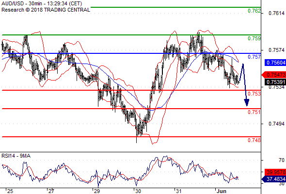 จุดที่ต้องการ: สถานะขายต่ำกว่า 0.7570 เป้าหมายต่อไปที่ 0.7530 และ 0.7510