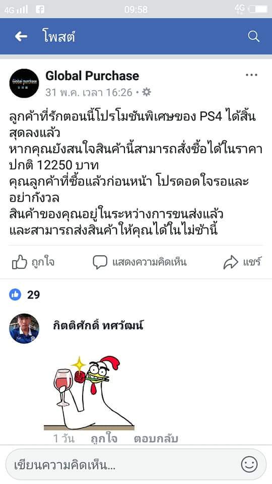 หน้าเพจเป็น ps4 pro บอกราคาว่าลดเหลือ1980บาท หรืออาจจะถูกกว่านั้น แถมยังเป็นสินค้าเหลือค้างสต๊อคเลยขายถูก ใครก็อยากได้กันทั้งนั้นแต่! สิ่งที่ได้มามันคือเครื่อง famicom นั้นเอง ใส่ตลับกันเพลินเลยหละครับงานนี้ ใครที่คิดจะซื้ออะไรผ่านเฟสบุคก็ดูที่มาและสอบถามให้ระเอียดนะครับถ้าไม่แน่ใจโพสถามผ่านทางพันทิปก็ได้ครับ อย่าตกเป็นเหยื่อคนพวกนี้ วานหน่วยงานที่เกี่ยวข้องช่วยดูแลทีครับ