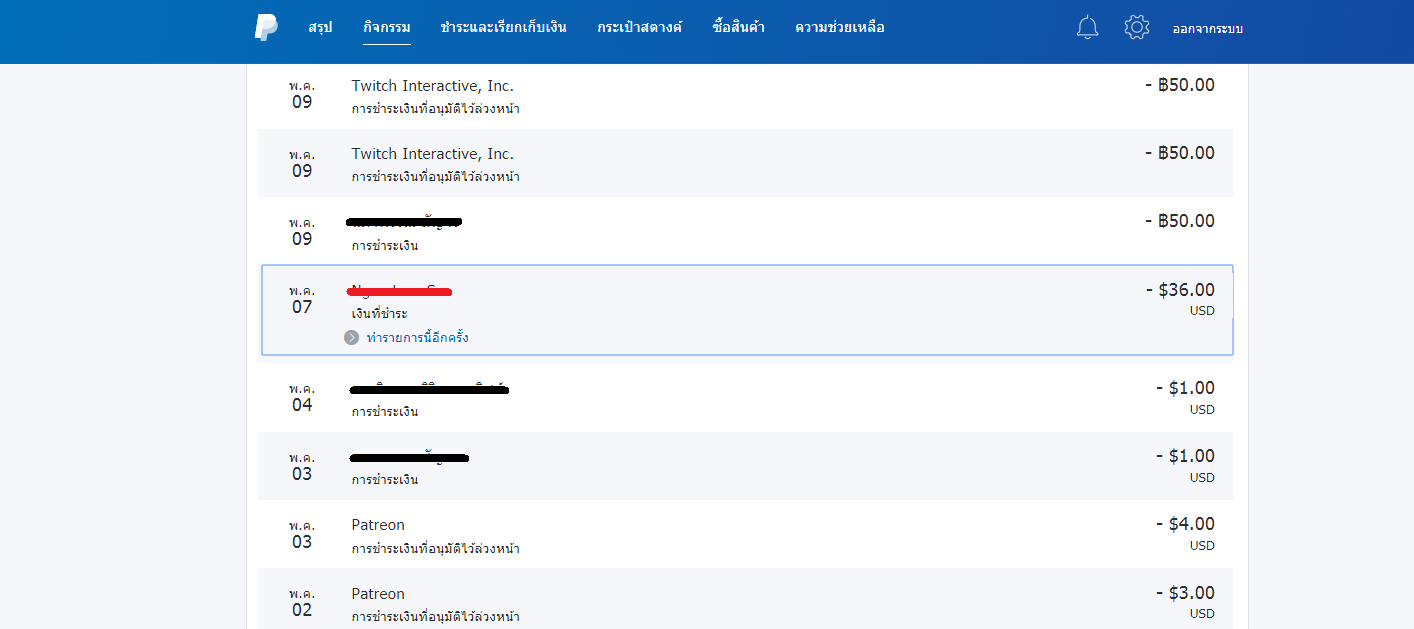 แล้วพอผมเช็คในบัญชี paypal ในส่วนของ คนที่ผมโอนเงินไปให้ มันกลับขึ้นแบบนี้ ซึ่งต่างจาก รายอื่น