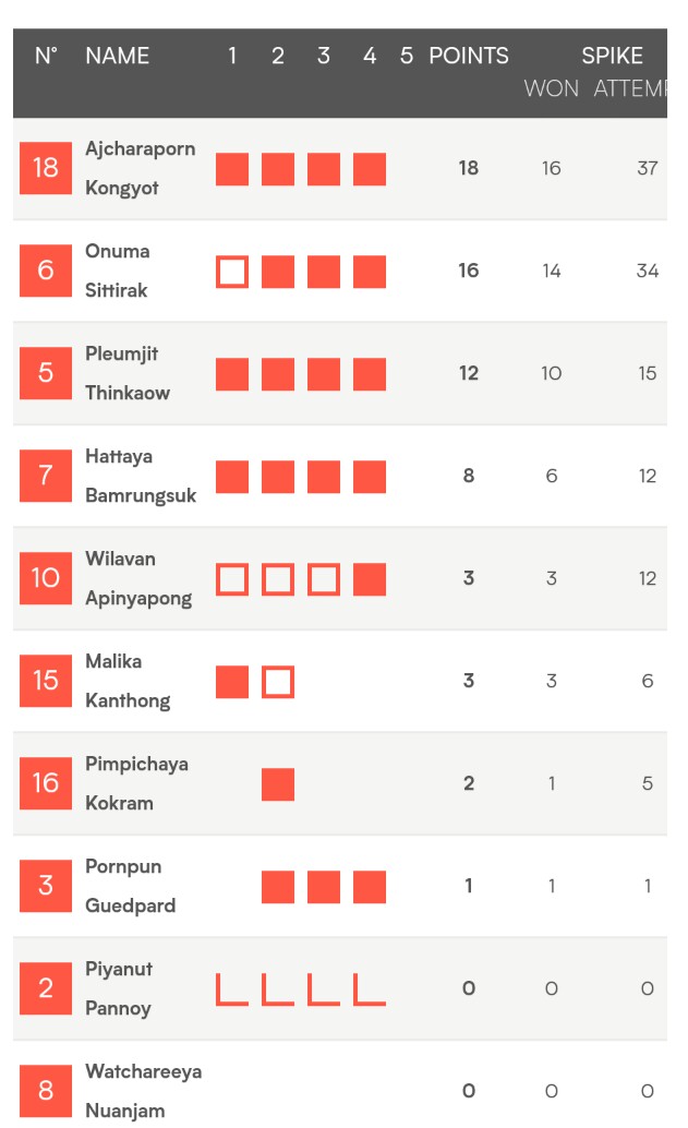 ผลการแข่งขัน THA 2:3 NED 25-23 , 17-25 , 25-23 , 10-25 , 14-16 TOP SCORE 🇹🇭 PIMPICHAYA 20 POINT 37% SASIPAPORN 14 POINT 29% CHATCHU-ON 9 POINT 23% TOP SCORE 🇳🇱 NIKA 26 POINT 49% TIMMERMAN 14
