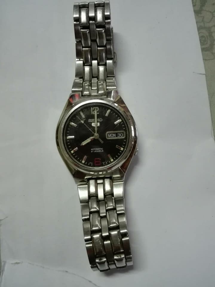 Seiko 5 หน้าดำ รุ่น 7s26 ออโตเมติก 21 Jewels ฝาหลังเปลือยแสดงการทำงานภายใน สภาพใหม่มากๆ แทบหาริ้วรอยไม่เจอ หน้าปัดสีดำ เข็มวิสีแดง กระจกใสๆ พรายน้ำสว่าง แสดงวันภาษาอังกฤษและอาหรับ สายสแตนเลสตีตรา Seiko ทำงานปกติทุกระบบ พร้อมใช้ยาวๆ ตัวนี้สวยมาก ตัวเรือนกว้างประมาณ 36.5 มม.