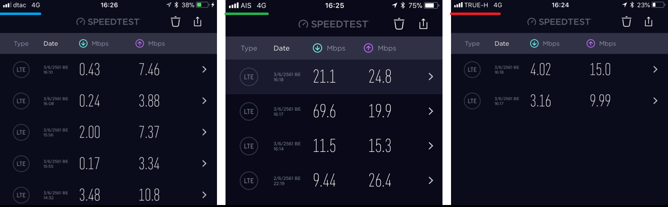 ผมเคยแจ้งย้ายค่ายเพื่อซื้อมือถือใหม่ เมื่อ พฤศจิกายน 2560 แต่ก็โดนยื้อ และอันนี้ผมผิดเองที่เห็นแก่ส่วนลด (ไม่โทษใคร) จึงอยู่กับ DTAC ต่อ เพื่อซื้อ iPhone 8 Plus ตลอดระยะเวลาที่ผมใช้ DTAC ในช่วง 3-4 เดือนแรก ทรมานมาก เนตไม่เคยวิ่งได้เร็วตามที่โฆษณา ด้วยความที่ผมเดินทางบ่อย นี่คือพื้นที่ๆผมใช้ตลอด และไม่เคยใช้ได้เกิน 2-3 mb เลย สมุทรปราการ, บางนา, เทพารักษ์, ศรีนครินทร์ (อยู่ห่างศูนย์ DTAC 200 เมตร), กลางอโศก, ชลบุรี, ระยอง