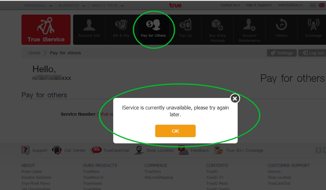 จะจ่ายค่าเน็ต ออฟฟิศ (ไม่ใช่ชื่อผม) เข้าไปจ่ายใน iService พอกดจ่ายแบบ นี้ ก็ขึ้น Error