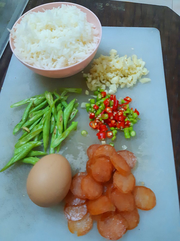ข้าว/ไก่เชียง/กระเทียม/พริกขี้หนูสด/ถั่วฝักยาว