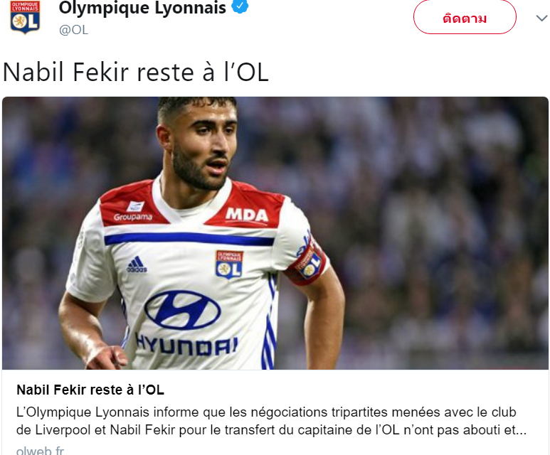 Olympique Lyonnais have announced that the tripartite negotiations conducted with Liverpool and Nabil Fekir with regard to the transfer of OL's captain have no produced a conclusive result and that OL have decided to end these negotiations at 2000 hours this evening.