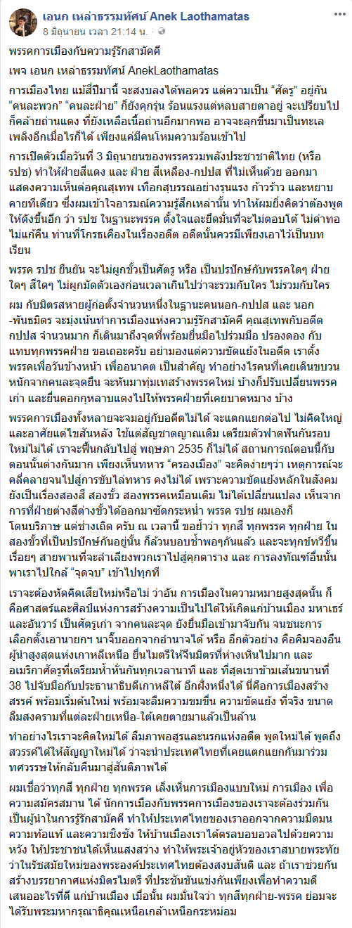 ร่วมหัวจมท้ายไล่รัฐบาลที่มาจากประชาชนหวัังผลตามมาว่าคงได้เสวยสุข หวังจับมือกับศาสดาเทือกจัดตั้งพรรคหลัง ปชป. ไม่เอาทั้งหม่อมทั้งเทือก สุดท้ายก็กลายเป็นลุง แก่ ๆ นั่งจิบวายน์เลี้ยงลูกเลี้ยงหลาน อนาคตทา