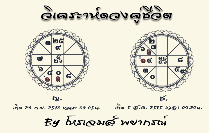 สวัสดีครับ วันนี้ผมได้เขียนบทวิเคราะห์คู่ชีวิต จากประสบการณ์ที่ได้มีโอกาสตรวจดวงชะตากับบุคคลท่านหนึ่ง ซึ่งได้ขออนุญาตเจ้าของดวงชะตาทั้ง 2 คน ให้ผมได้นำเรื่องราวส่วนหนึ่งมาเรียบเรียงเขียนให้อ่านและรวมถึงหลักเกณฑ์ในการวิเคราะห์ด้วยหลักโหราศาสตร์ ตามความเหมาะสมเพื่อให้ได้ประโยชน์กับผู้ที่สนใจศึกษาวิชาโหราศาสตร์ และ ผู้ที่ได้อ่านเนื้อหาส่วนนี้เกิดประโยชน์ไม่มากก็ประมาณหนึ่งนะครับ