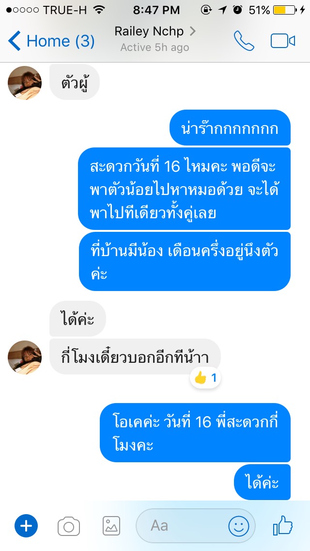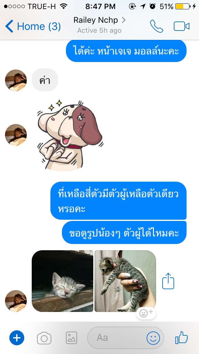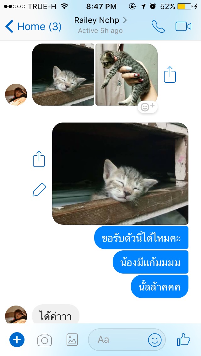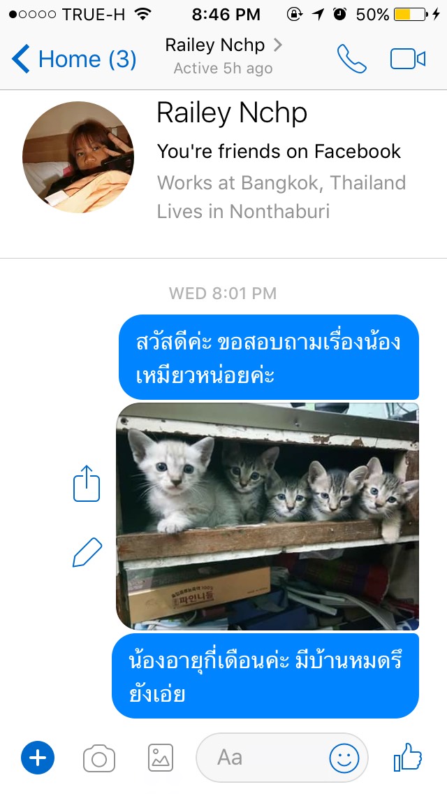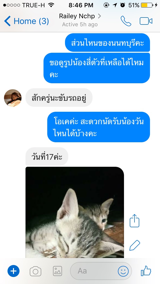 อุทาหร์สอนใจค่ะ ใครจะรับน้องแมวไปเลี้ยง ตรวจสอบให้ดีนะคะ จะได้ไม่โดนหลอก เราเจอคุณมาย ชื่อ Account Facebook Railey Nchp ใจเพจเพจนึง เป็นเพจประกาศหาบ้านให้น้องแมวค่ะ ที่บ้านเรามีน้องอยู่ตัวนึงค่ะอายุเดือนครึ่ง (เราแยกออกมาอยู่คนเดียวค่ะ ส่วนที่บ้านคุณแม่มีน้องๆ 3ตัวค่ะ) อยากหาเพื่อนให้น้อง เพราะน้องซนมากๆค่ะ น้องมีเพื่อน น้องน่าจะเล่นกันได้ ลดความซนลง น้องที่บ้านติดคนมากๆด้วยค่ะ เค้ามีเพื่อนเวลาเราออกไปทำธุระ น้องจะได้ไม่เหงา เราเลยไปเจอโพสของคุณ มาย ประกาศหาบ้านให้น้องแมว เราเลยทักไปสอบถามค่ะ คุณมายชื่อ สะดวกนัดรับน้องวันที่ 16 มิย. นัดรับที่ เจเจมอลล์ เราก็ตกลงค่ะ คุณมายแจ้งว่า เวลาจะนัดอีกทีนึง หลังจากนั้นเราไปหาหมอทำกายภาพบำบัดมาค่ะ ซึ่งรอบหน้าตรงกับวันที่คุณมาย สะดวกเป็นวันนี้ไหม เพราะเรากลัวเวลาชนกันค่ะ และอีกอย่าง เราอยากให้น้องๆได้ทำความรู้จักกันด้วยค่ะ ตอนเเรกคิดว่านัดรับวันที่ 16 จะได้พาน้องที่รับมาจากคุณมายไปหาหมอ พร้อมกับน้องที่บ้านค่ะ แต่คิดไปคิดมา ถ้าน้องได้ทำความรู้จักกันก่อนน่าจะดีค่ะ แต่พอถึงวันนี้วันที่รับน้อง คุณมาย เช้าโทรไปคอนเฟิร์มยืนยันว่านัดรับวันนี้ 5 โมงเย็น 6 โมง พอตกบ่ายหายเงียบไปเลยค่ะ สักพักทักมาบอกว่าฝนตก ทางเราก็ไปเดินเล่นซื้อของรอค่ะ จนฝนหยุดค่ะ เราก็ทักไปบอกคุณมายว่าฝนหยุดแล้วนะคะ คุณมาย ก็ได้หายเงียบไปเลยค่ะ โทรไปก็ไม่รับติดต่อก็ไม่ได้ เรารออยู่สามชั่วโมงค่ะ เราลองไปเชคในเพจน้องแมวหาบ้าน หลายๆเพจ ก็มีคุณมาย โพสหาบ้านให้น้องแมวตลอด แทบทุกเพจเลยค่ะ เลยไม่ทราบว่า เคยมีใครได้รับน้องจากคุณมาย ไปบ้างรึเปล่า ฝากถึงเพื่อนๆ พี่ๆน้องๆ ที่อยากรับน้องแมวหาบ้านนะคะ เชคข้อมูลดีๆนะคะ ไม่อยากให้โดนหลอกค่ะ จริงๆถ้ามีเหตุผลไม่สะดวกวันนี้ หรือว่าฝนตกน้ำท่วม บ้านอยู่นนบุรีไม่สะดวก นัดเจอครึ่งทางหรือให้นัดรับที่ได้ก็ได้ค่ะ ไม่จำเป็นต้องทำกันแบบนี้เลย ไม่น่ารักเลยค่ะ คนรักน้องแมวอย่างเราก็เสียความรู้สึกค่ะ เราตื่นเต้นดีใจมากที่จะได้เจอน้อง แต่ก็ต้องผิดหวังกลับบ้าน ฝากเพื่อนๆ ช่วยแชร์ และฝากเป็นอุทาหรณ์กันด้วยนะคะ