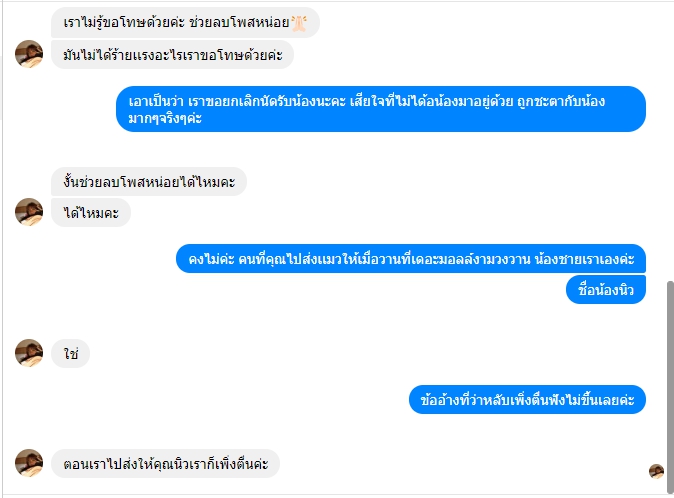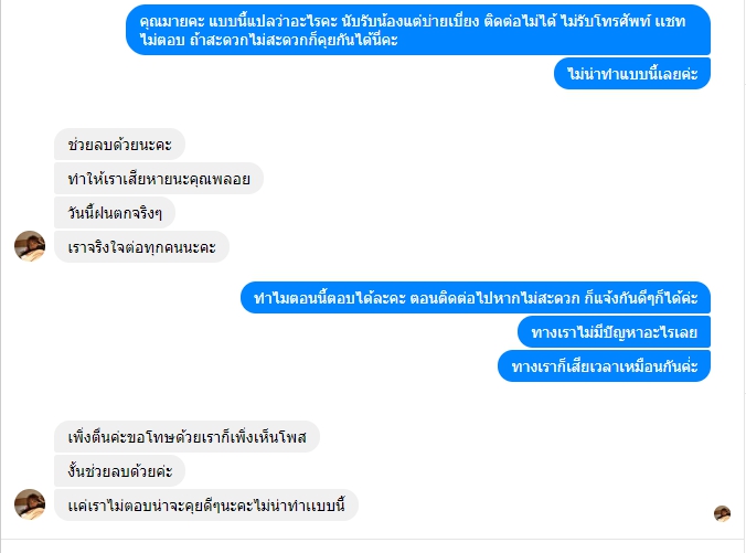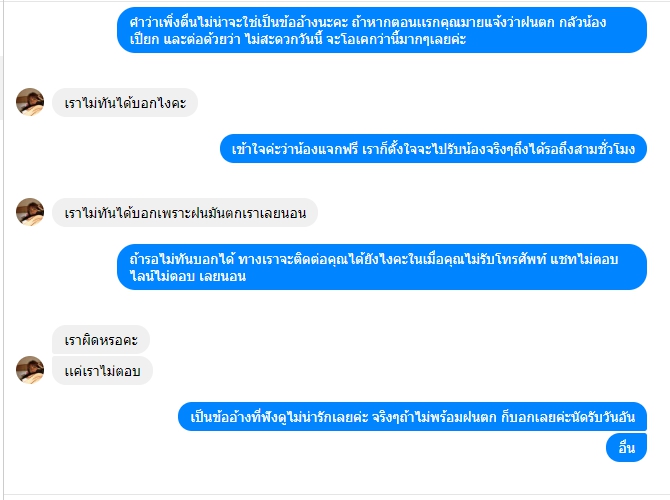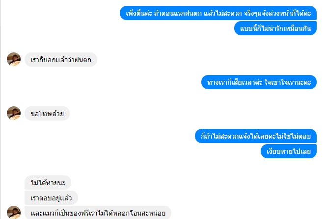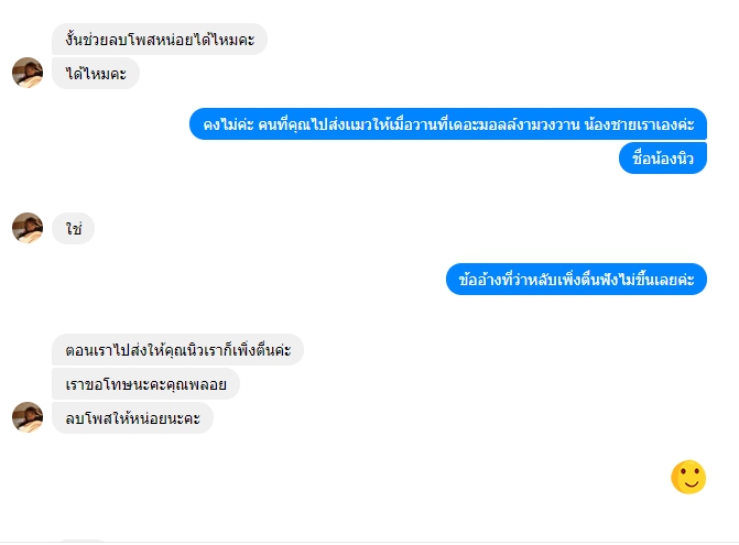 แก้ไขเพิ่มเติม : ข้ออ้างของคุณมายคือ "เพิ่งตื่น" ทางเราทราบดีค่ะว่าแมวเด็ก ตากฝนจะป่วย ทางเราเตรียมของ เตรียมกระเป๋ากันฝนพร้อม เพียงแค่แจ้งว่า ไม่สะดวกออกมาส่งน้องเพราะฝนตก นัดเป็นวันอื่นเหตุผลจะฟังขึ้นมากกว่านะคะ ให้เหตุผว่า "เพิ่งตื่น" ทางเราเสียความรู้สึกมากๆ เพราะเราตั้งตาคอยน้องมากๆ การที่เผลอหลับแล้วให้เหตุผลว่า เพิ่งตืน ใช่ค่ะ มันดูจริงใจ แต่ ใจเขาใจเรานะคะ คนรอก็รอโดยไม่รู้อะไรเลย คนหลับก็หลับสบาย น้องชายเราก็รับแมวมาจากคุณมายนะคะ แต่คุณมายก็เพิ่งตื่น ไปส่งน้องแมว แบบนี้ไม่น่ารักเลยจริงๆค่ะ เป็นอุทาหรณ์ และโปรดใช้วิจารณญาณและพิจารนาในการอ่านโพสด้วยนะคะ เรามาบอกต่อด้วยความหวังดีค่ะ
