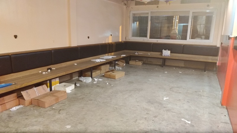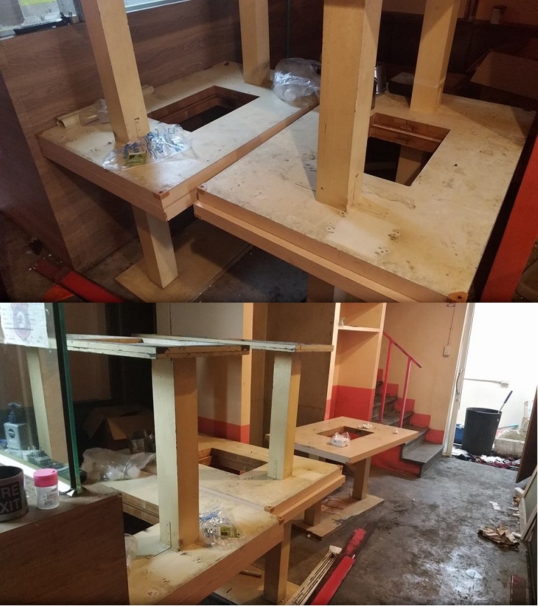 โต้ะ ที่มีประเด็น จากลักษณะโต้ะ จะเห็นว่า มีรูโหว่งตรงกลาง ในภาพมีโต้ะทั้งหมด 5 ตัว และขนาดที่ใหญ่ถ้าเอามาเรียงให้ลูกค้านั่งจริงๆที่ไม่พอ จะเอาขึ้นชั้น 2 บันไดกว้างแค่นี้ก็ไม่น่าพอขึ้นอีก โปรดจำรูโหว่งตรงกลางโต้ะไว้นะครับ เพราะต่อไปจะมีภาพหม้อสุกี้ ที่วางที่ชั้น 2 มาอีก จากที่ดูมันจะพอดีกับชุดหม้อสุกี้เป้ะเลยเนื่องจากผมอยากจะเล่าไปทีละชั้นๆ ซึ้งในชั้นนี้บอกตามตรง กลิ่นเหม็นอับมาก