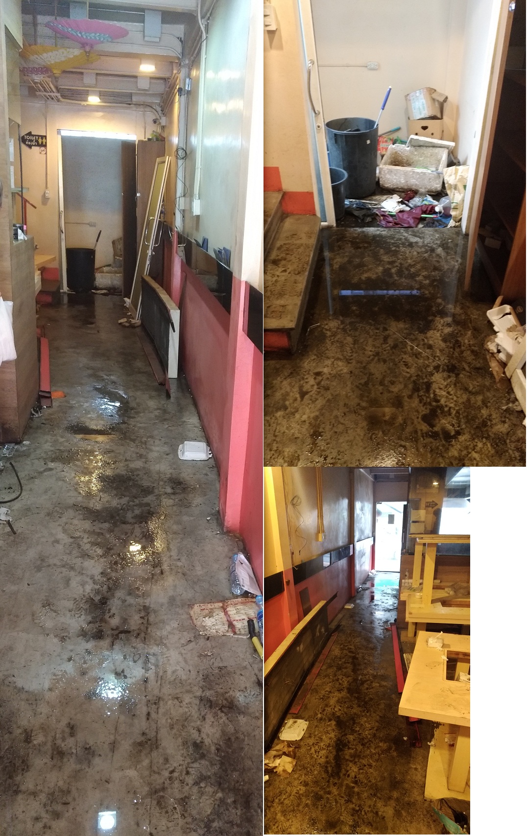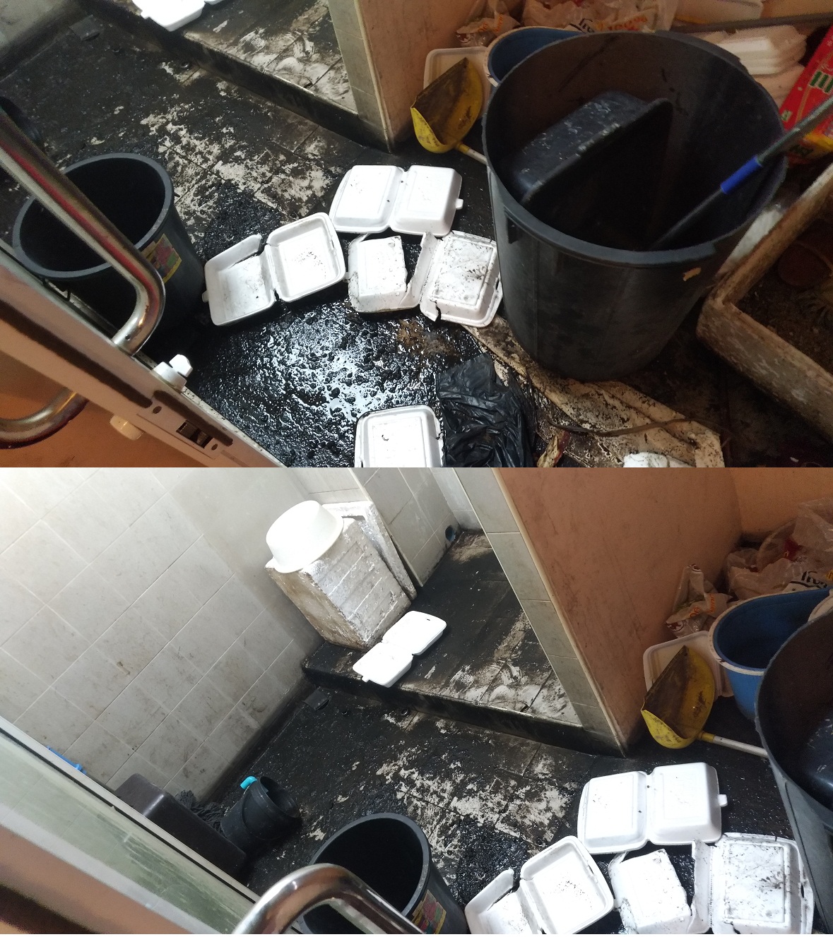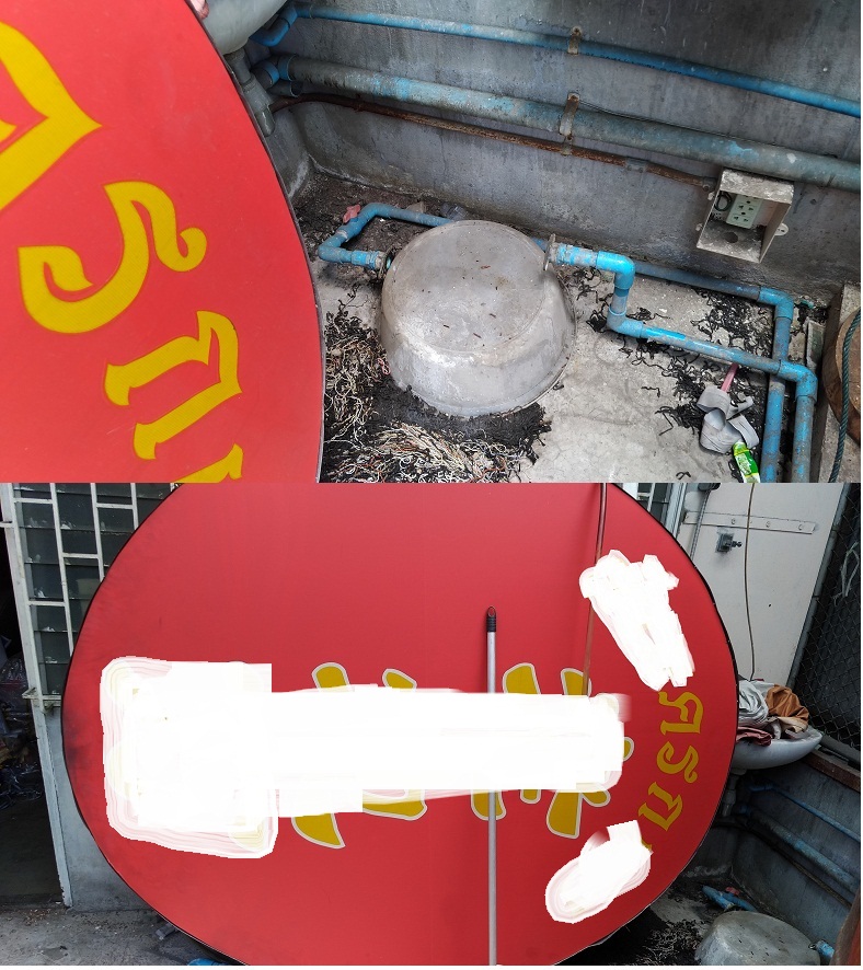 สภาพหลังบ้านจุดที่นํ้าท่อตันทะลักออกมา สปกรกจนรับแทบไม่ได้ในกล่องโฟมในภาพ ผมไปแง้มออกมา แมลงสาบโผล่มาเต็มเลย