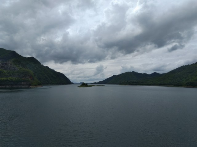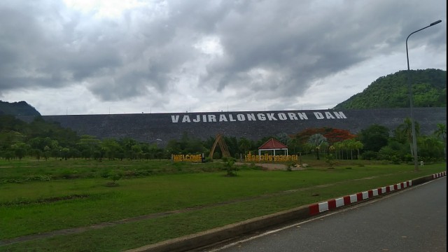 พอมาถึงทองผาภูมิ ไม่มีฝน แค่อากาศครึ้มๆ เราแวะกันที่เขื่อนวชิราลงกรณ์