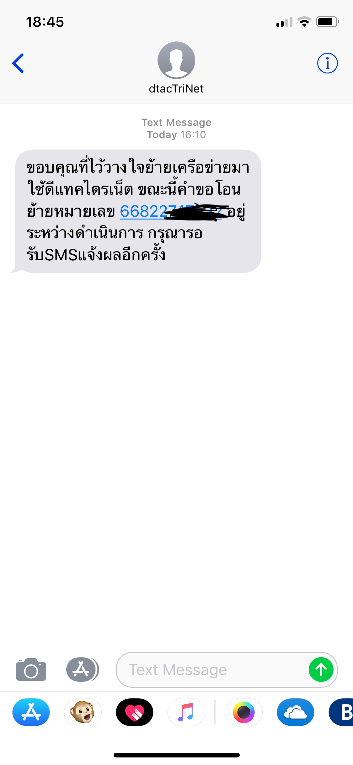 รบกวนครับ 089666xxxx ย้ายไปดีแทคสำเร็จยังครับ sms เงียบเลยครับ