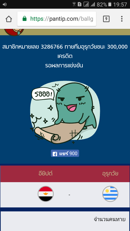 ผม ถูก 2 ผิด 2 / ทายอุรุกวัย เสมอ อียิปต์ ดันมายิงทายเกมส์ ส่วน คู่สเปน ก็ทาย สเปนชนะ ดันโดนมาตีเสมออีกท้ายเกมส์ เสียดายจริง ไม่งั้นถูก 4 คู่แล้ว !! ของเพื่อนๆเป็นไงกันบ้างครับ มาลุ้นอันดับกันวันนี้ เ
