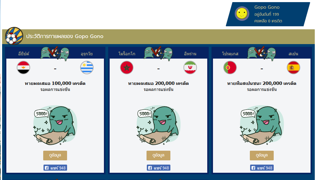 ผม ถูก 2 ผิด 2 / ทายอุรุกวัย เสมอ อียิปต์ ดันมายิงทายเกมส์ ส่วน คู่สเปน ก็ทาย สเปนชนะ ดันโดนมาตีเสมออีกท้ายเกมส์ เสียดายจริง ไม่งั้นถูก 4 คู่แล้ว !! ของเพื่อนๆเป็นไงกันบ้างครับ มาลุ้นอันดับกันวันนี้ เ