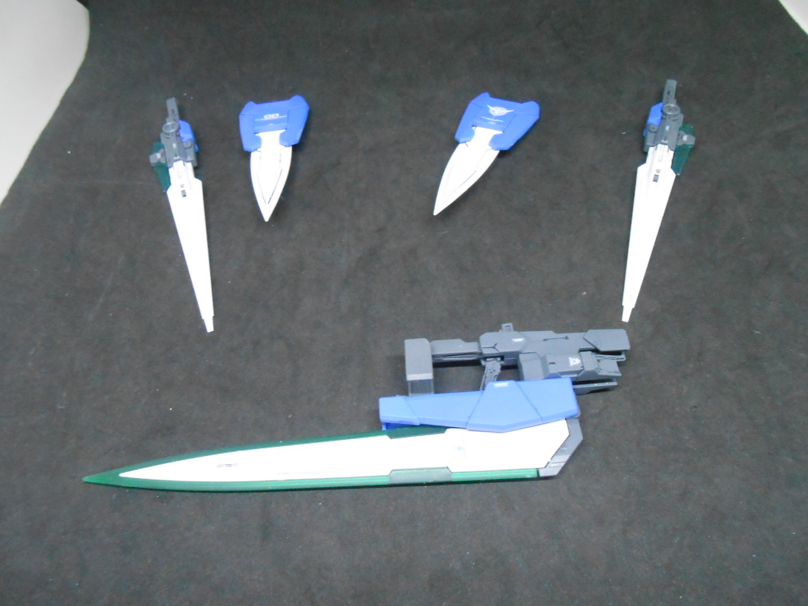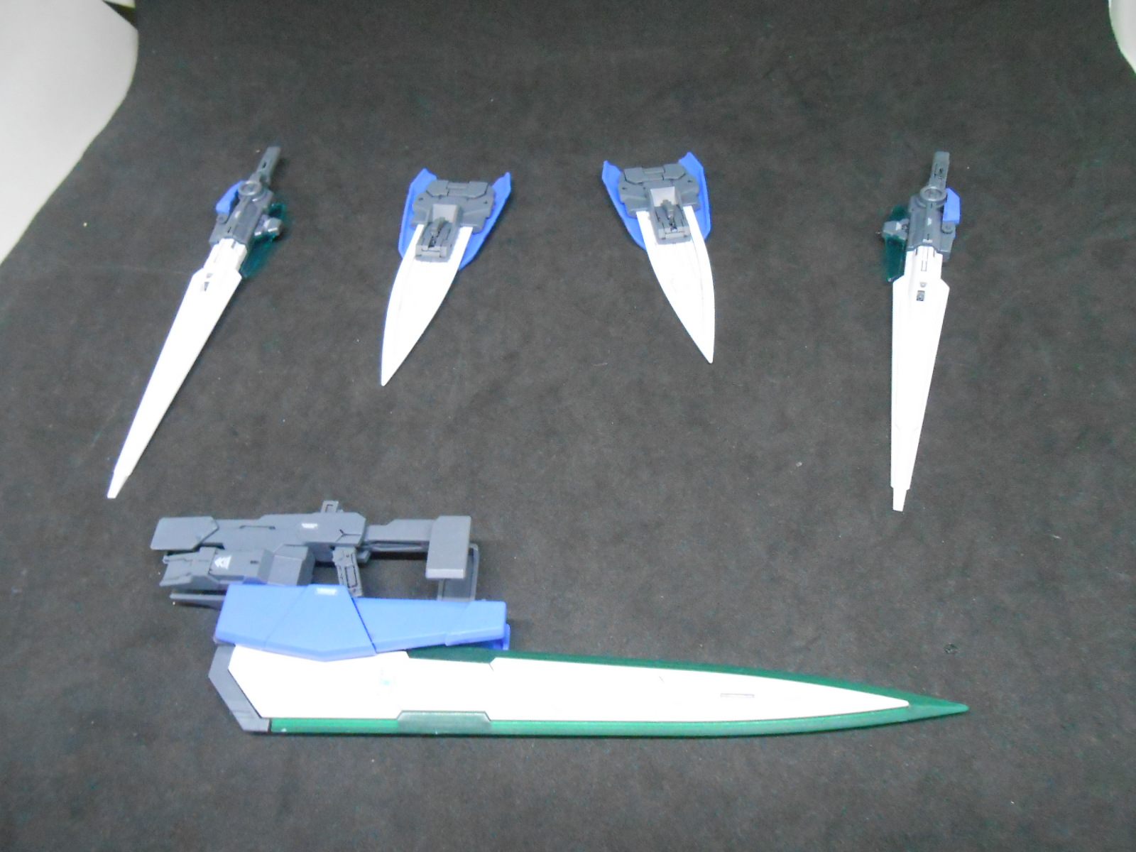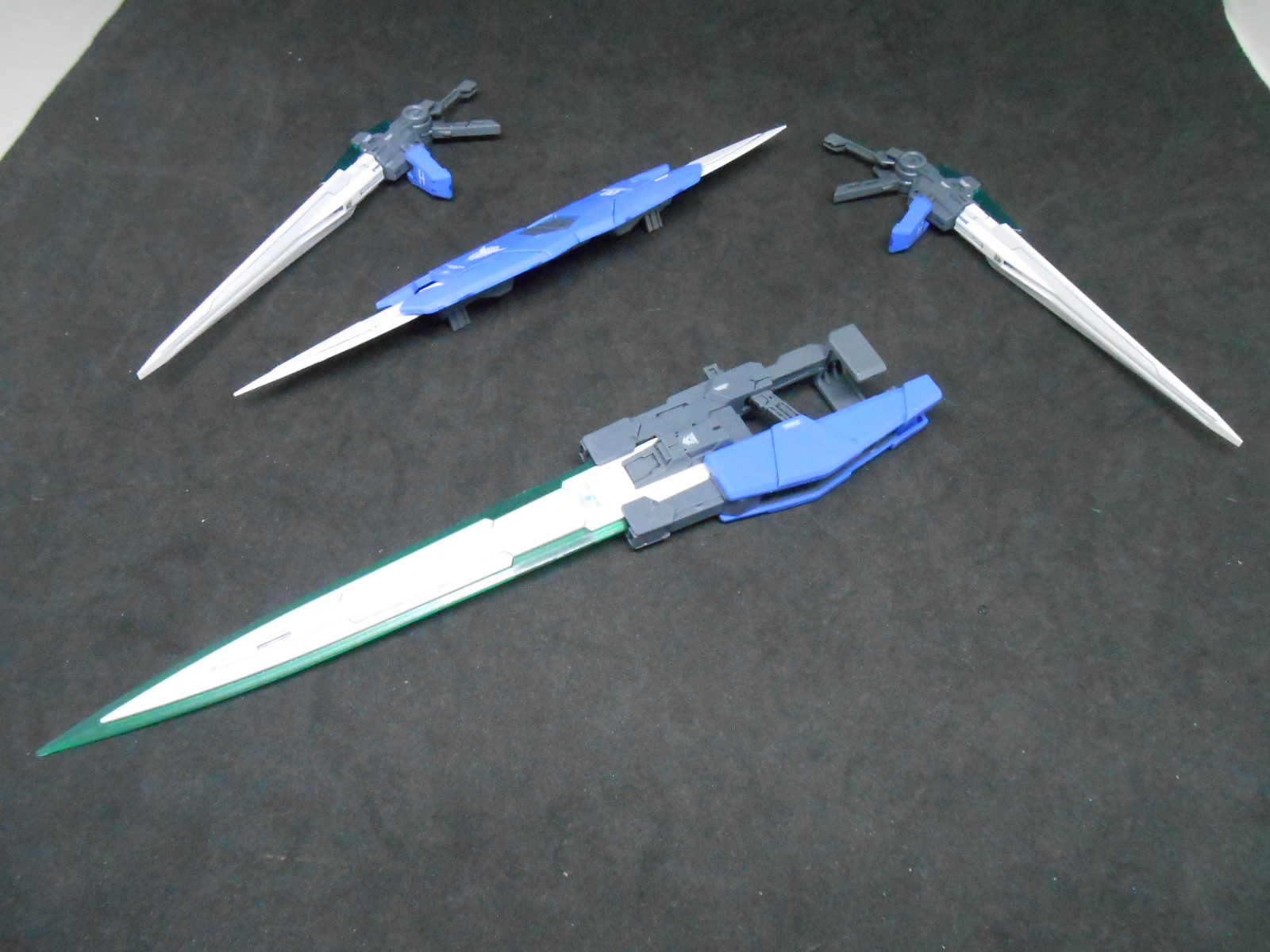 ส่วนตัว GN Sword II จะเปลี่ยนเป็น Rifle คู่ก็ได้ ตัว GN Sword III จะพับเอาคมดาบไว้ข้างหน้าได้ หรือจะยกขึ้นก็ได้ และโ,่ก็เอามาเชื่อมติดกันได้ แต่ต้องถอดชิ้นส่วนสีน้ำเงินด้านหน้าออกก่อน แล้วค่อยเปลี่ยนตำแหน่งใส่ใหม่