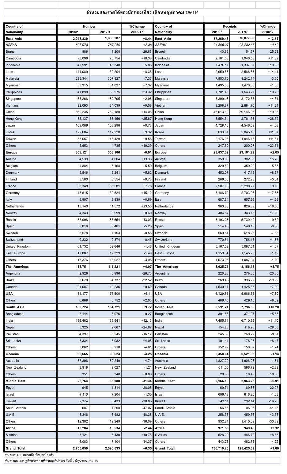 จำนวนนักท่องเที่ยว ต่างชาติ เดือน พฤษภาคม เติบโต 6.35% เที่ยบกับเดือนเดียวกันของปีก่อน รายได้เติบโต 9%