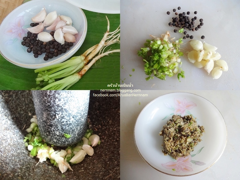 โขลกรากผักชี กระเทียม พริกไทยรวมกันเตรียมไว้ก่อน
