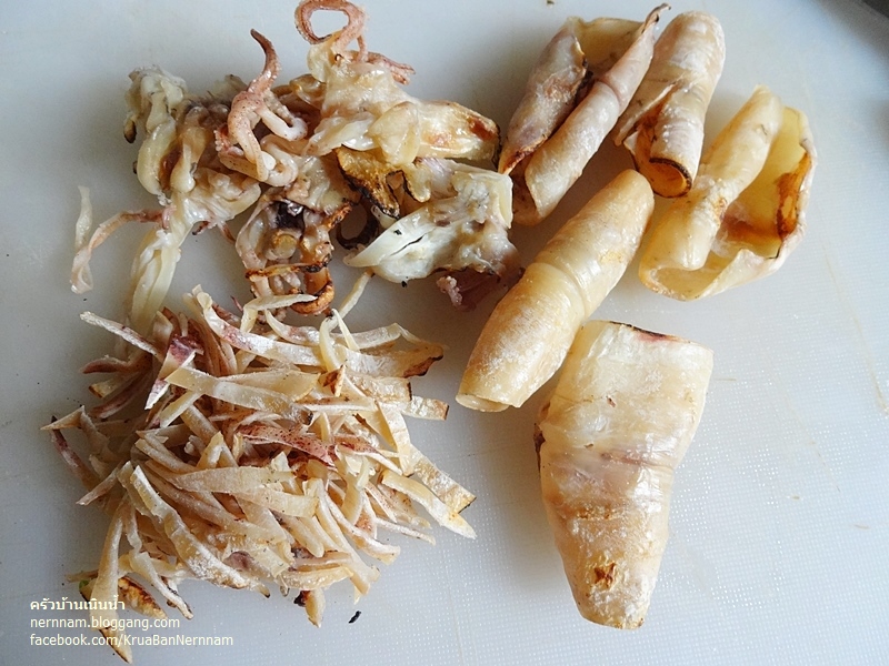 ปลาหมึกแห้งนำมาล้างทำความสะอาด แล้วปิ้งด้วยไฟอ่อน ๆ ให้มีกลิ่นหอม ใช้กรรไกรตัดเป็นเส้นเตรียมไว้