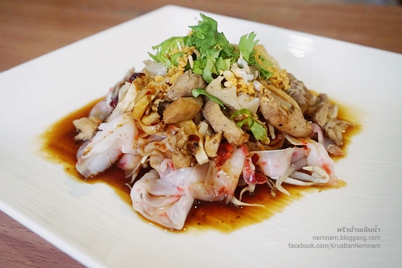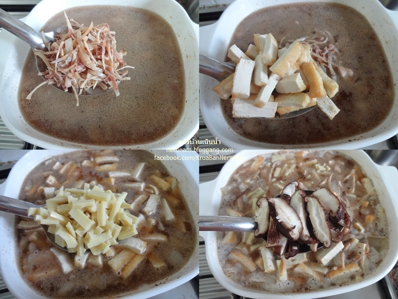ใส่หมึกแห้ง เต้าหู้ทอด หน่อไม้ต้ม และเห็ดหอม