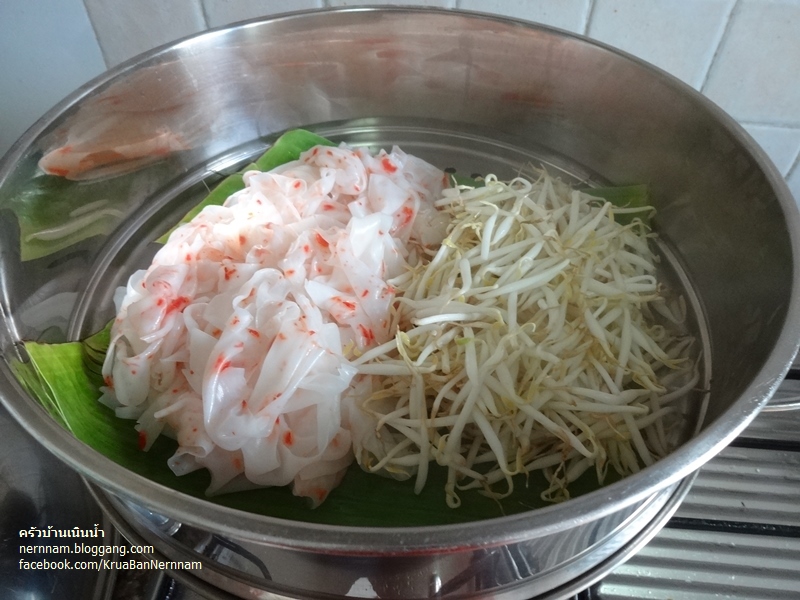 นึ่งบนน้ำเดือดให้ก๋วยเตี๋ยวร้อนและถั่วงอกสุก ถ้าไม่ชอบถั่วงอกสุกมาก ก็ให้นึ่งเส้นก๋วยเตี๋ยวก่อนแล้วใส่ถั่วงอกลงนึ่งภายหลัง