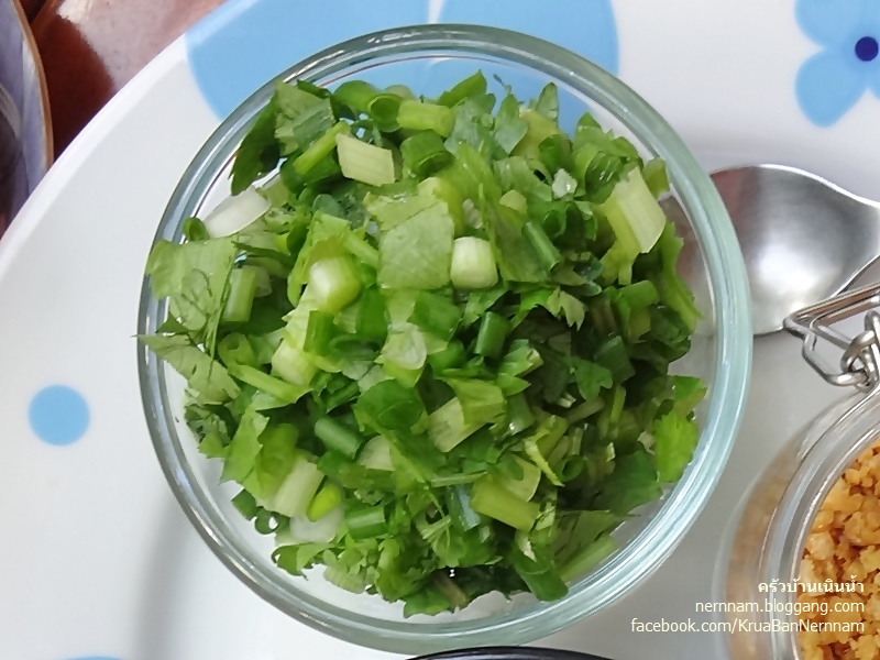 หั่นซอยผักชี ต้นหอม ใบคึ่นช่าย เตรียมไว้ ผสมกันทั้งสามชนิดให้กลิ่นหอมและเข้ากับก๋วยเตี๋ยวหลอดมาก