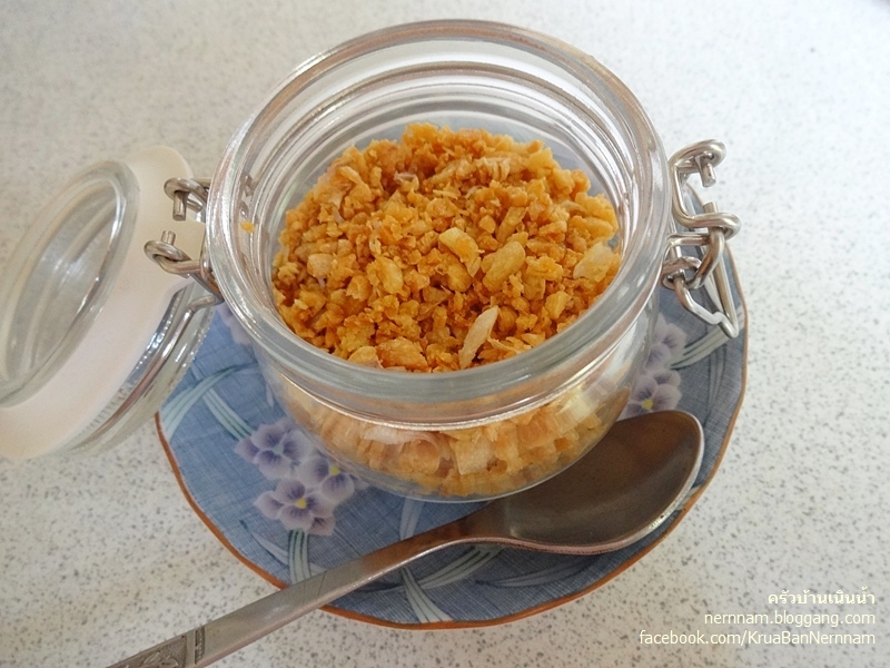 เจียวกระเทียมเสร็จแล้วเอาน้ำมันเจียวออกให้หมด เหลือแต่เนื้อกระเทียมกรอบ ๆ อร่อยไปอีกแบบค่ะ
