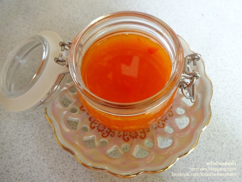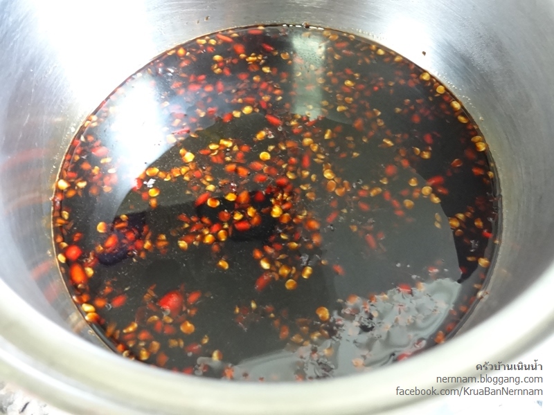 นำขึ้นตั้งไฟอ่อนให้น้ำตาลละลายและเดือด ชิมรสให้ได้สามรส ปิดไฟแล้วจึงใส่พริกขี้หนูซอย