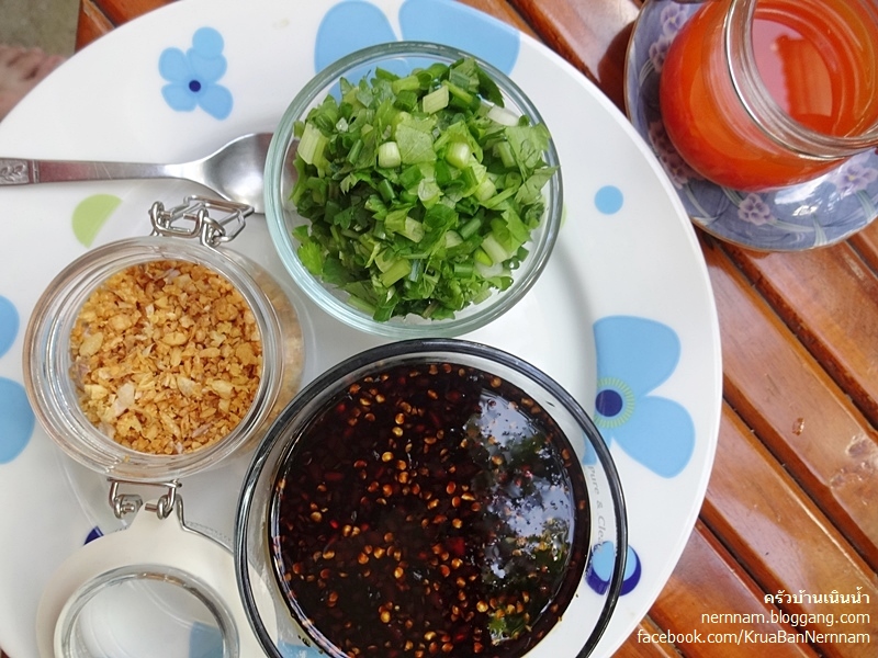 โรยด้วยผักต่าง ๆ และกระเทียมเจียว ปรุงรสด้วยพริกน้ำส้ม ทุกอย่างปริมาณตามชอบ