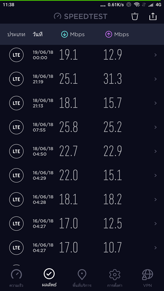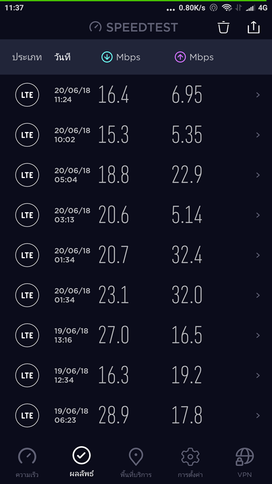 แต่มาช่วงหลัง ๆ นี้ วิ่งไม่เคยถึง 30Mbps เลย เทสเวลาไหน ๆ ก็ได้ไม่เกิน 20กว่า ๆ (เทสแทบทั้งวัน แม้กระทั่งช่วงเวลาที่คนน่าจะใช้น้อย ๆ อย่างตี 3 - ตี5)