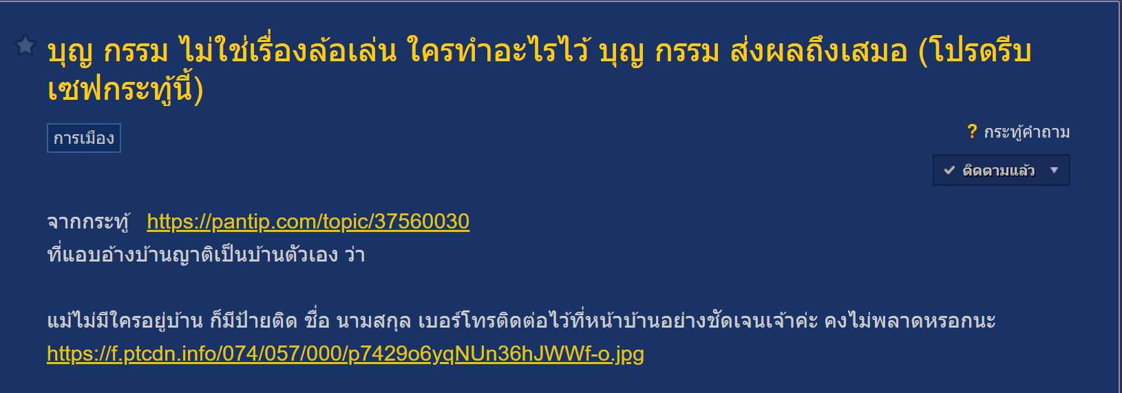 เนื้อหาในกระทู้มีแต่ข้อมูลส่วนตัวเพื่อนสมาชิกทั้งที่เกี่ยวข้องโดยตรงและไม่เกี่ยวข้อง