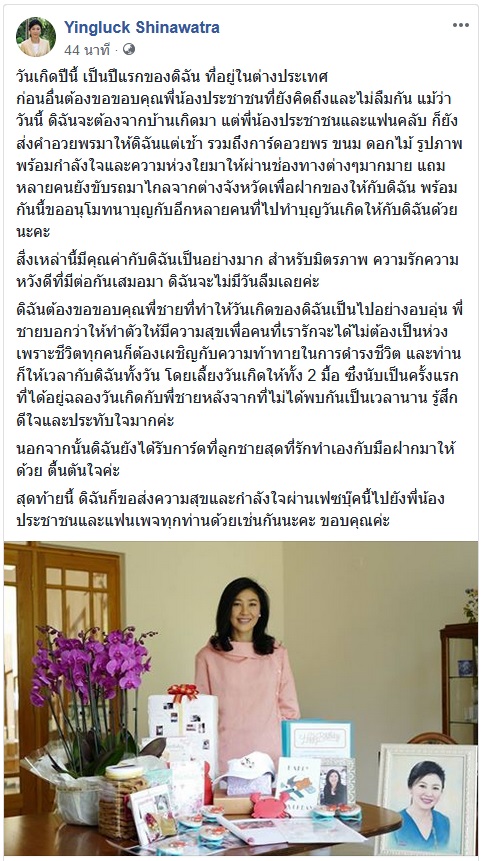 JJNY : จากเพจ "Yingluck Shinawatra" ข้อความจากนายกปู นายกที่มาจากประชาชน เนื่องในโอกาสวันครบรอบวันคล้ายวันเกิด