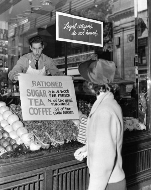 แผงขายผลไม้และของชำในตลาดอังกฤษ พร้อมป้ายระบุปริมาณสินค้าปันส่วนที่ซื้อได้ในแต่ละครั้ง ได้แก่ น้ำตาล คนละครึ่งปอนด์/สัปดาห์ ชา ครึ่งหนึ่งของปริมาณซื้อปกติ และกาแฟ สามในสี่ของปริมาณซื้อปกติ โปรดสังเกตป้ายด้านบน ที่มีข้อความว่า “พลเมืองที่ซื่อสัตย์ย่อมไม่กักตุน”