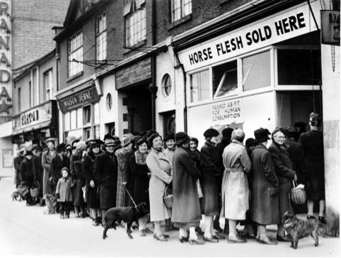 ชาวอังกฤษเข้าแถว (พร้อมบัตรลงทะเบียนปันส่วนอาหาร) เพื่อซื้อเนื้อม้า (อ่านไม่ผิดหรอก…ดูป้ายหน้าร้านได้) เนื่องจากเนื้อวัวมีราคาแพงและหายากในช่วงสงคราม สังเกตว่า หน้าร้านมีข้อความสามบรรทัดอ่านได้ว่า ผ่าน(การตรวจ) แล้วว่า เป็นสิ่งที่มนุษย์บริโภคได้ (ภาพนี้ถ่ายเมื่อ วันที่ 17 เมษายน ค.ศ. 1941)