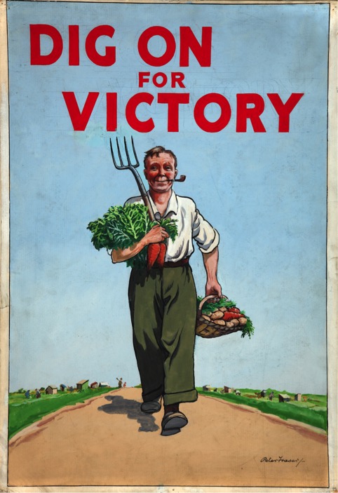 “ขุดเพื่อชัยชนะ” (Dig of Victory) ที่ส่งเสริมให้เจ้าของบ้านปลูกผักไว้เป็นอาหาร ในเวลานั้นจะพบว่า ตามลานจอดรถ สวน หรือแม้แต่คูน้ำของหอคอยลอนดอนก็เปลี่ยนไปเป็นแปลงผักทั้งหมด กล่าวได้ว่าสวนผักนั้นเปรียบได้กับ “โรงงานผลิตอาวุธ” ที่มีอาหารให้กับประชาชนในชาติยามต้องการได้เป็นอย่างดี