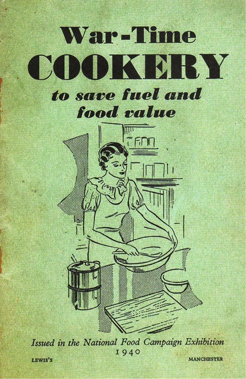 คู่มือแนะนำการปรุงอาหารยามสงคราม เน้นประหยัดเชื้อเพลิง และรักษาคุณค่าอาหาร จัดทำขึ้นในนิทรรศการรณรงค์อาหารแห่งชาติ ที่เมืองแมนเชสเตอร์ ประเทศอังกฤษ ค.ศ. 1940