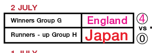 รอบ 16 อังกฤษจะเจอกับญี่ปุ่นครับ โดยอังกฤษจะเข้ามาเป้นอันหนึ่งของกลุ่ม เเละตบไปเบาๆเท้า เเบบไม่จีรังอะไรมากนัก