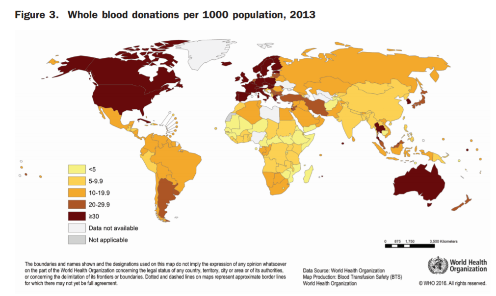 จะเห็นว่าประเทศที่บริจาคโลหิตเยอะ จะเป็นประเทศพัฒนาแล้วเกือบทั้งหมด