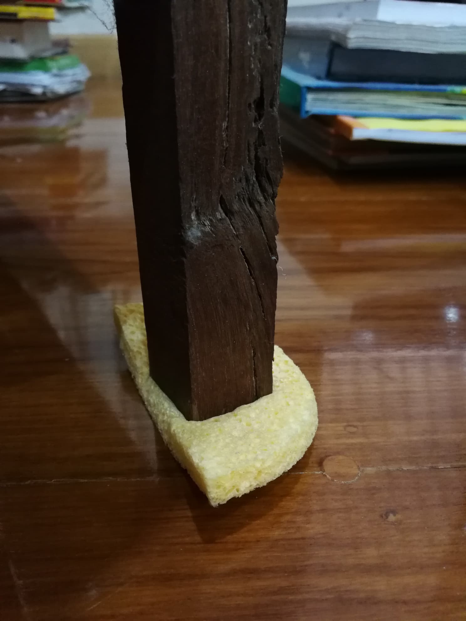 ชั้นนี้วางของหนักมาก พอดีมีฟองน้ำถูตัวยังไม่ได้แกะใช้เลยเอามาตัดแบ่งครึ่งแล้วเอามารองแทน พอดีแผ่นรองหมดคับ