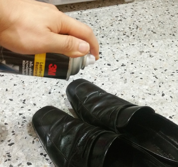 พอดีที่หน้ากระป๋องเขียนว่า Leather & Tire เอาไว้พ่นเคลือบเงาเบาะหนังในรถยนต์ ยางดำ ยางรถยนต์ประมาณนี้ คิดว่า รองเท้ามันหนังเหมือนกันน่าจะได้ครับ