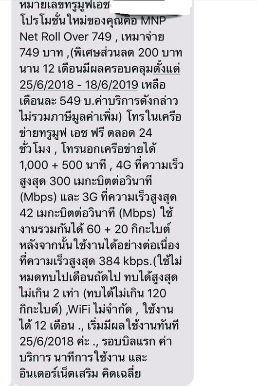 สงวนสิทธิ์เฉพาะเบอร์ 095xxxxxxx มอบโปรโมชั่น โปรโมชั่น MNP Net Roll Over 749 , เหมาจ่าย 749 บาท (พิเศษส่วนค่าบริการเดือนละ 200 บาท นาน 12 เดือน เหลือเดือนละ 549 บ.ค่าบริการดังกล่าวไม่รวมภาษีมูลค่าเพิ่ม) , โทรในเครือข่ายทรูมูฟ เอช ฟรี ตลอด 24 ชั่วโมง , โทรนอกเครือข่ายได้ 1,000 นาที , 4G ที่ความเร็วสูงสุด 300 เมกะบิตต่อวินาที (Mbps) และ 3G ที่ความเร็วสูงสุด 42 เมกะบิตต่อวินาที (Mbps) ใช้งานรวมกันได้ 60 กิกะไบต์ หลังจากนั้นใช้งานได้อย่างต่อเนื่อง ที่ความเร็วสูงสุด 384 kbps.(ใช้ไม่หมดทบไปเดือนถัดไป ทบได้สูงสุดไม่เกิน 2 เท่า (ทบได้ไม่เกิน 120 กิกะไบต์) ,WiFi ไม่จำกัด //พิเศษเฉพาะเบอร์นี้รับโบนัส: ฟรี DATA เดือนละ 20GB นาน 12เดือน มีผลรอบบิลวันที่ 22/07/2018
