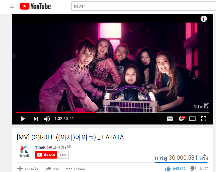 ผ่านมา 1 เดือน 23 วัน MV LATATA ของ (G)I-DLE ใน Youtube ผ่าน 30 ล้านเเล้ววว เพื่อนๆว่าจะถึง 100 ล้านไหม สิ้นปี?
