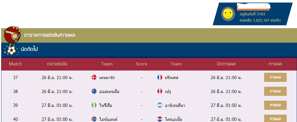 ผม ถูก 2 ผิด 2 / ทายอุรุกวัย เสมอ อียิปต์ ดันมายิงทายเกมส์ ส่วน คู่สเปน ก็ทาย สเปนชนะ ดันโดนมาตีเสมออีกท้ายเกมส์ เสียดายจริง ไม่งั้นถูก 4 คู่แล้ว !! ของเพื่อนๆเ