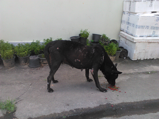 ค่ำนั้นก่อนเข้าบ้านก็แวะซื้ออาหารหมา ถุงใหญ๋ จะเอาไปให้มันกิน ปรากฏว่า หาตัวไม่เจอครับ มาเจอเอาอีกวัน สภาพย่ำแย่ ท่าทางไม่มีแรงจะเดินแล้ว
